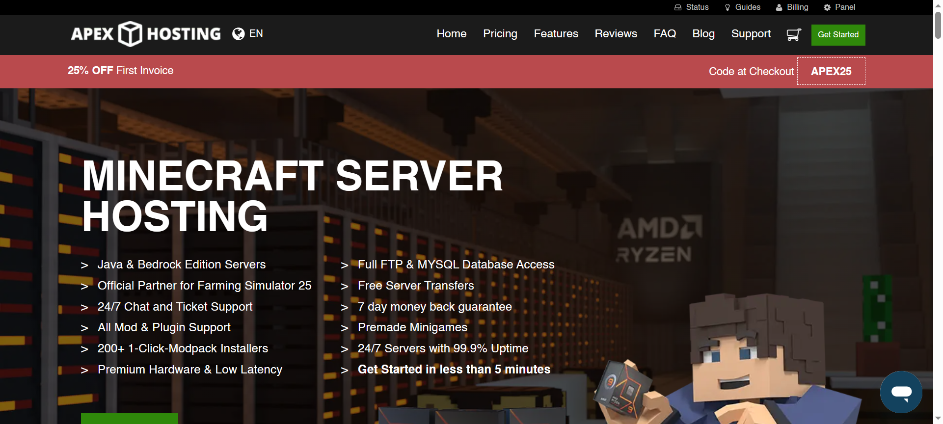 Apex Hosting is a leading game server provider specializing in Minecraft hosting, known for delivering high-performance and reliable servers since its establishment in 2013. The company uses modern hardware, including high-speed CPUs and SSD storage, to ensure smooth, lag-free gameplay, while providing DDoS protection to maintain server security and stability under heavy loads.